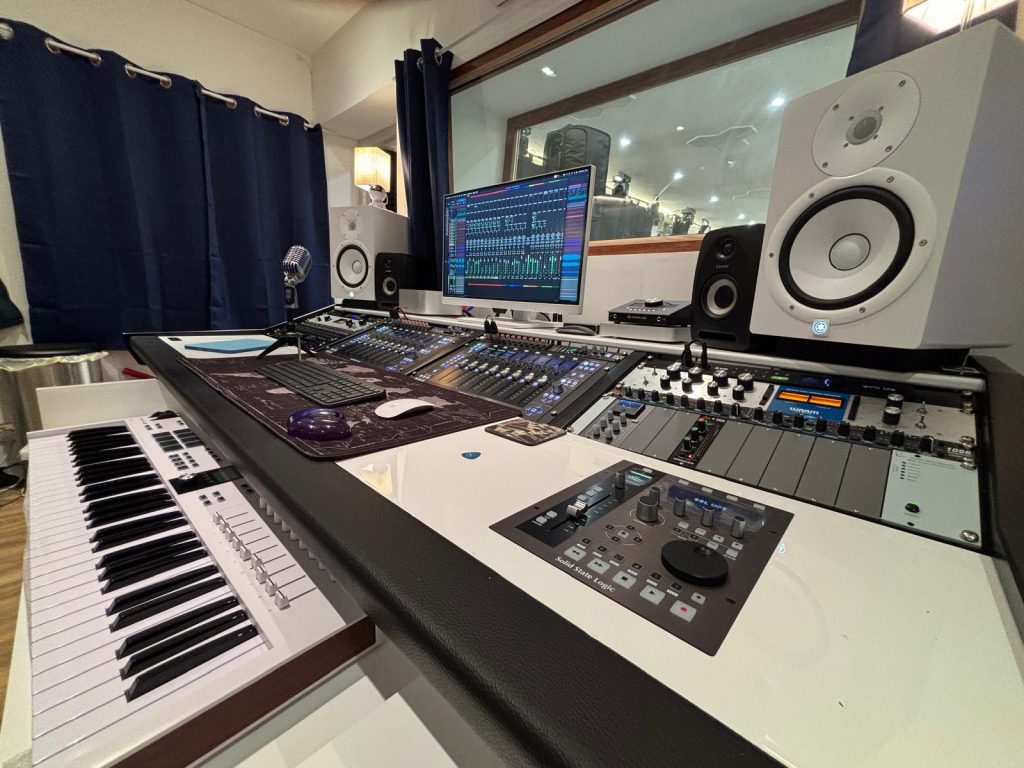 Showcasing the professional control room equipped with vintage and modern gear for flawless mixing and mastering.